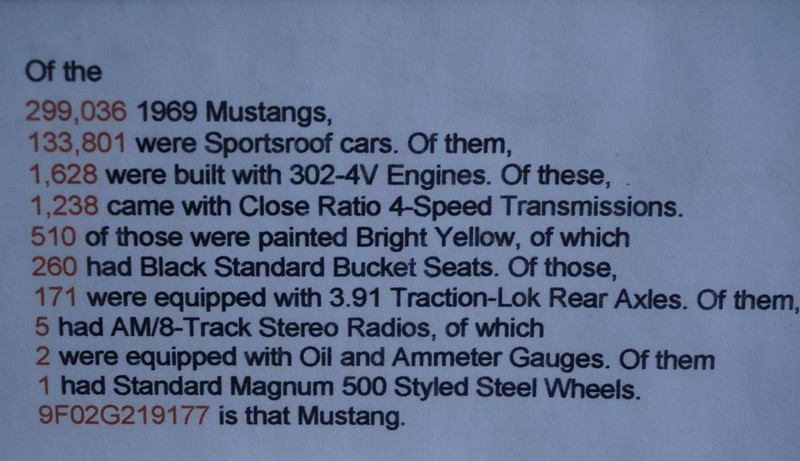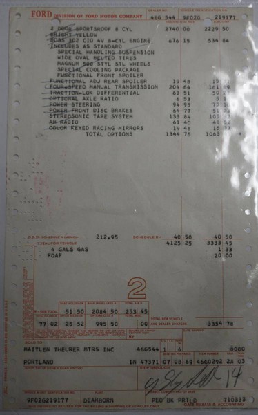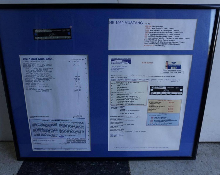 Drivetrain – The high-revving Boss 302 power plant was completely refurbished during the 2016-2017 restoration. The block is a D1ZE service replacement unit. Correct Boss 302 internals, cylinder heads and Buddy Bar Aluminum intake are all present. Fuel is delivered via a correct, date coded Holley C9ZF-J 4150 unit. Factory Smog system and Rev Limiter are intact. The car is shifted by what is believed to be the original 4-Speed Toploader Transmission with tag code RUG-E3. The correct 9″ rear end case is the heavy duty Nodular rear end “N” case and still sports it’s original Ford Identification tag. It is also believed to be the original unit to the car.