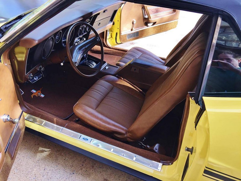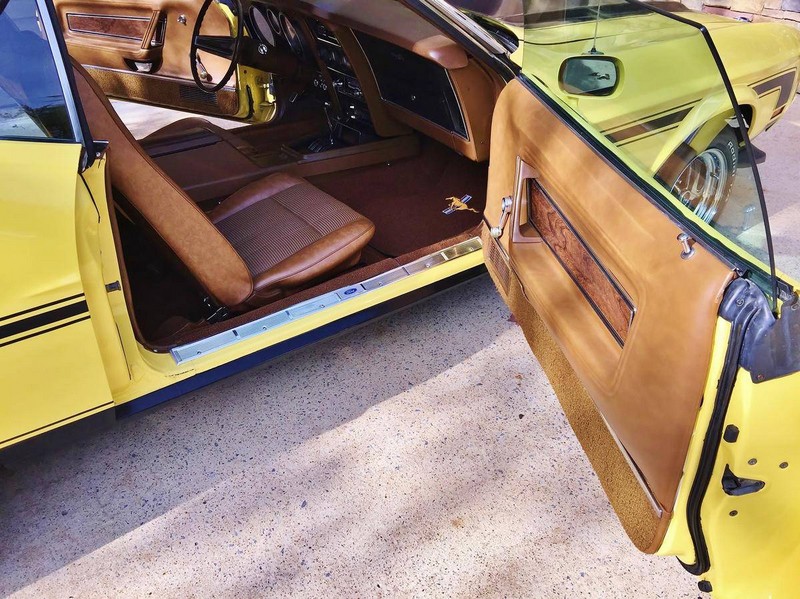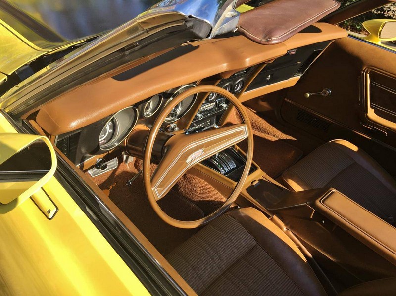 The car has front and rear spoilers, as well as side stripes and the “Tu-tone Hood,” complete with a NASA style scooped hood painted with the correct matte black finish and sporting functional hood locks. It also has a dual exhaust system with the correct H pipe, mufflers, and turn downs, a honeycomb rear panel, and an NOS pop open gas cap. The factory copper color was changed to its’ current (and more desirable) color of Medium Bright Yellow.