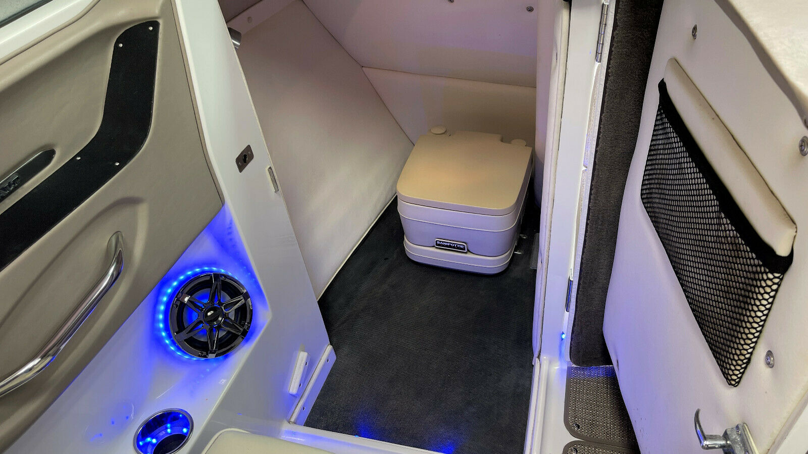 The boat has a spacious head compartment with a porta-potti, light, fan and toilet paper holder.