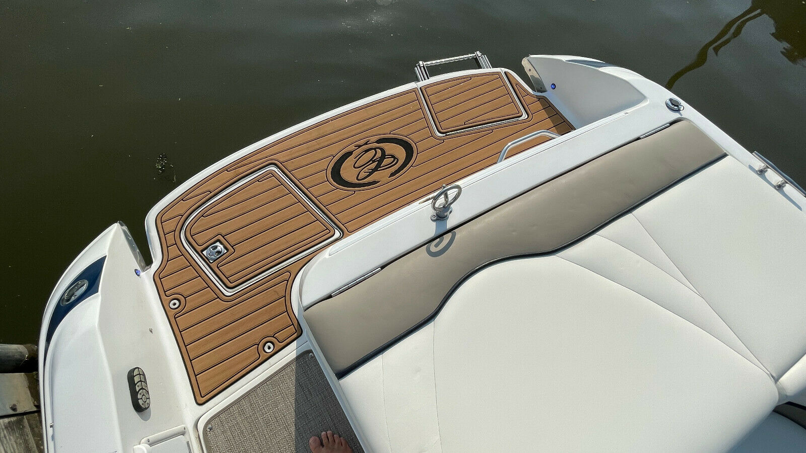 It has custom made Faux Teak decking with logo on the rear platform. It is stain resistant and soft as cotton. It is an anti-slip surface and grips bare feet/shoes when wet. This is the same decking you can option on larger brand new
