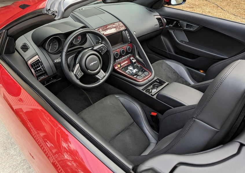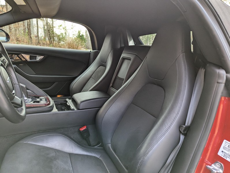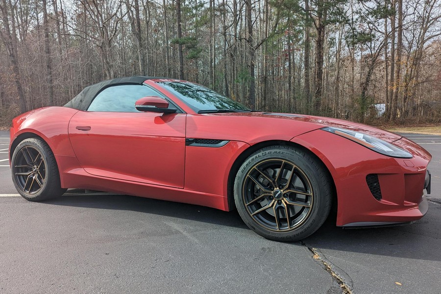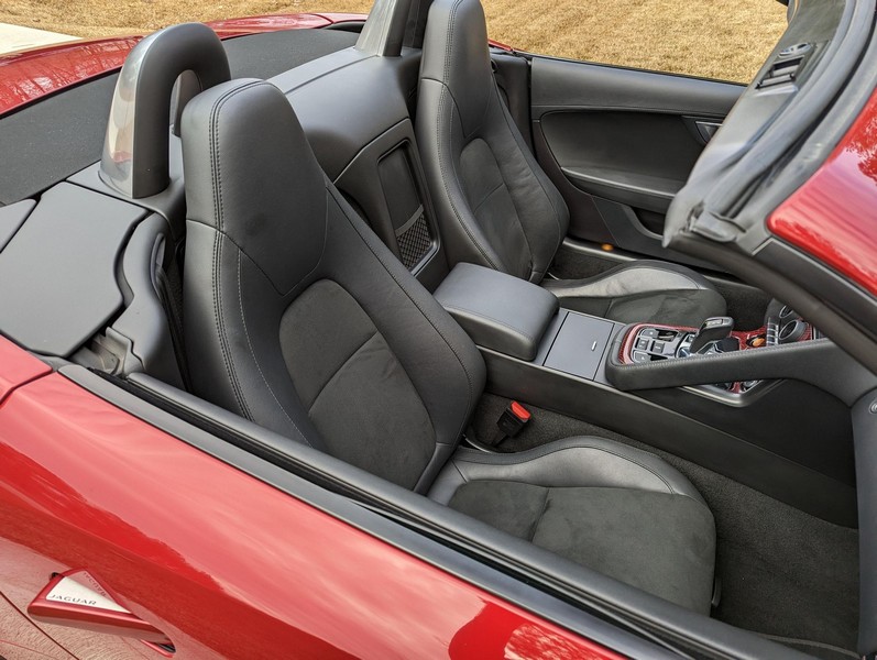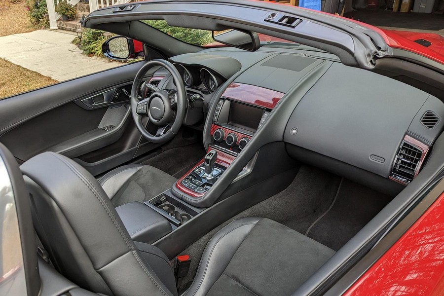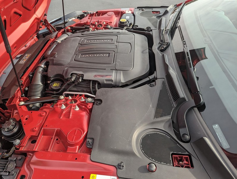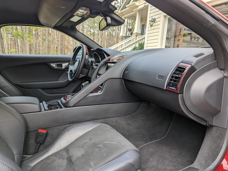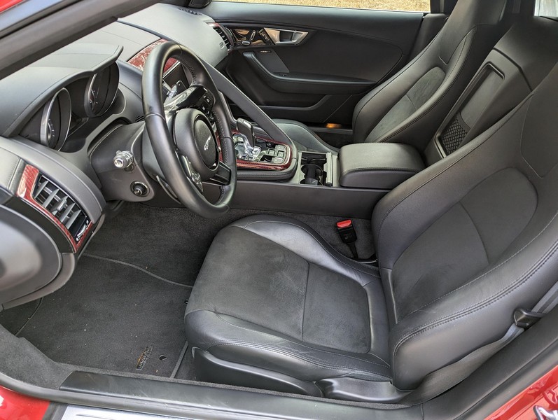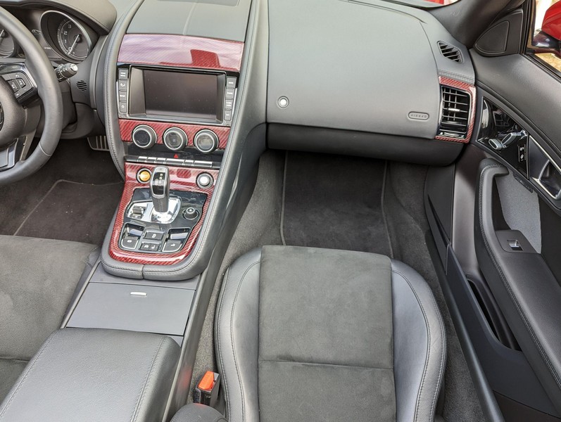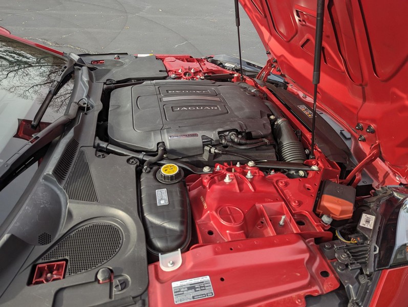 Modifications reported by the seller include a Velocity AP Stage 2 ECU tune and crank pulley, 18-inch Fast Wheels Aristo wheels, Eibach 15mm rear wheel spacers, gloss black hood and side vents, and red carbon fiber interior trim. A set of factory wheels and the removed trim components are included with the sale. Power comes from a 3.0-liter supercharged V6, rated at 340 horsepower and 332 lb-ft of torque. Due to the modifications performed to this F-Type, it may produce more power, but a dyno sheet was not provided to confirm. Output is sent to the rear wheels via an 8-speed automatic transmission.