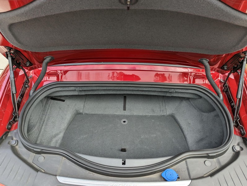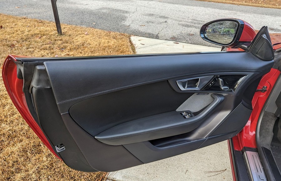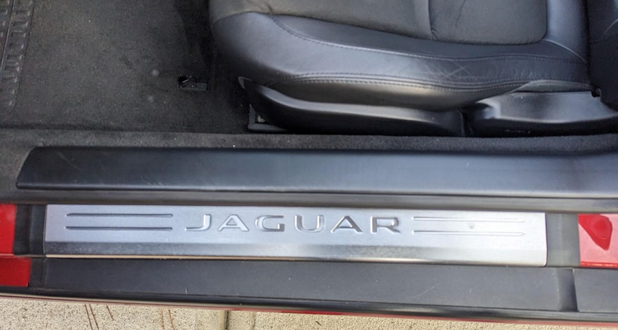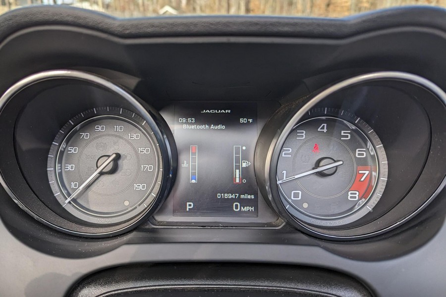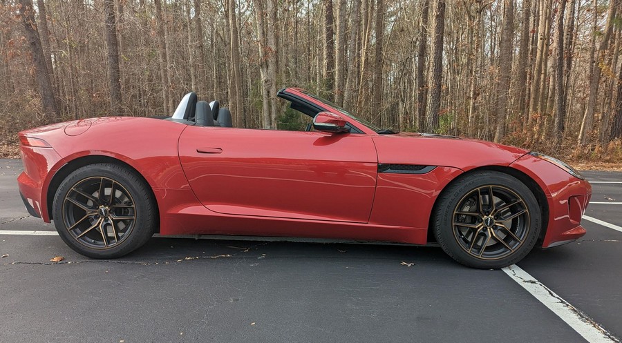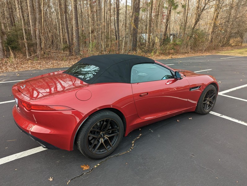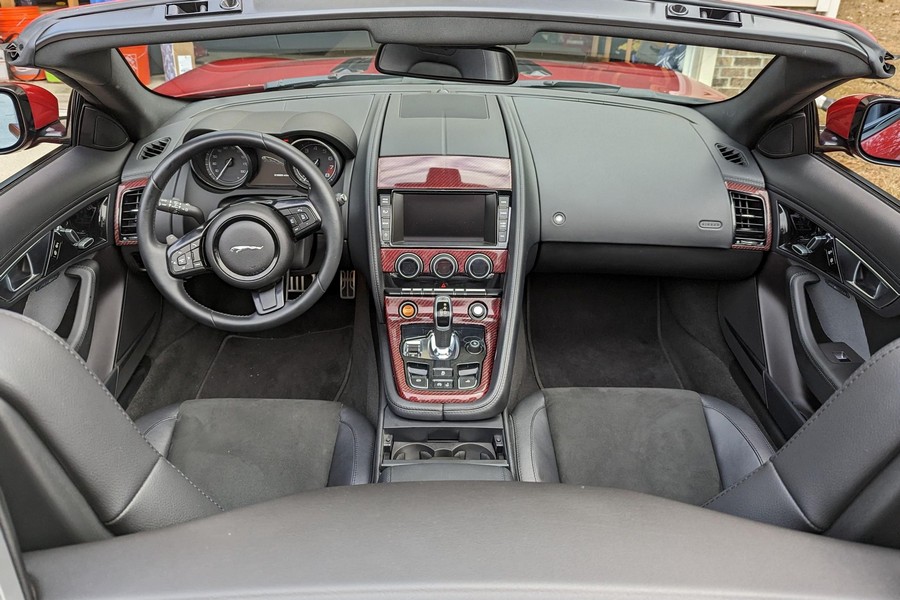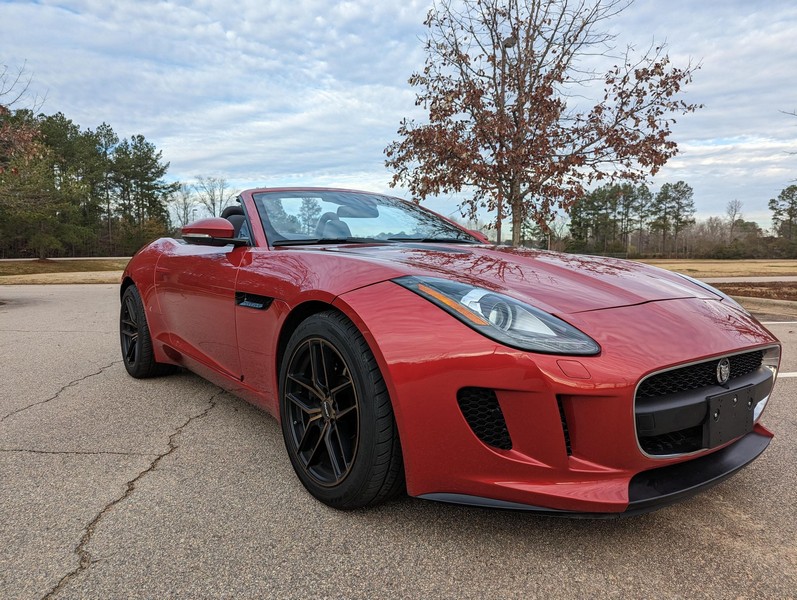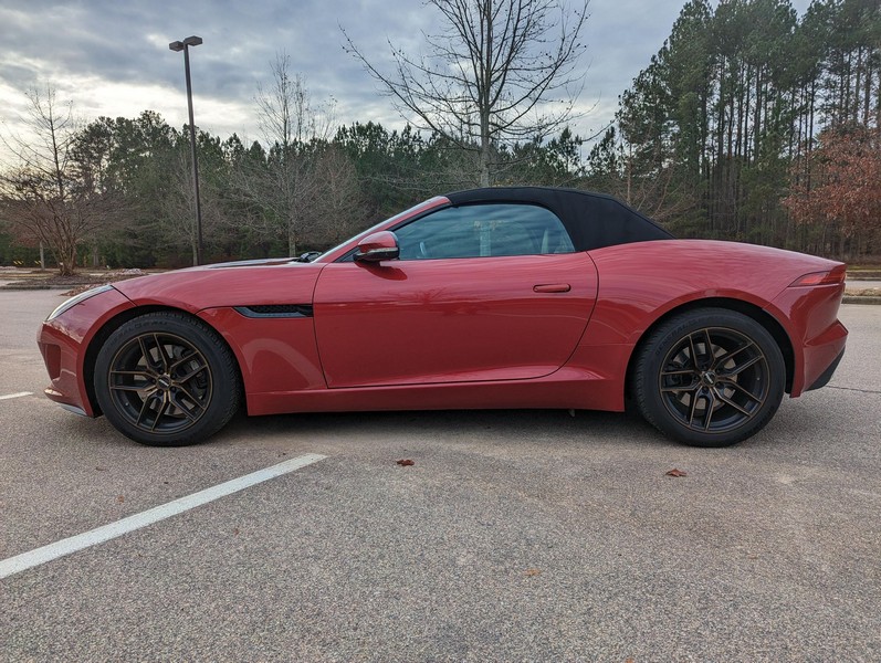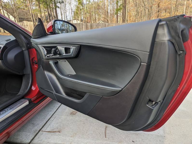 Modifications reported by the seller include a Velocity AP Stage 2 ECU tune and crank pulley, 18-inch Fast Wheels Aristo wheels, Eibach 15mm rear wheel spacers, gloss black hood and side vents, and red carbon fiber interior trim. A set of factory wheels and the removed trim components are included with the sale. Power comes from a 3.0-liter supercharged V6, rated at 340 horsepower and 332 lb-ft of torque. Due to the modifications performed to this F-Type, it may produce more power, but a dyno sheet was not provided to confirm. Output is sent to the rear wheels via an 8-speed automatic transmission.