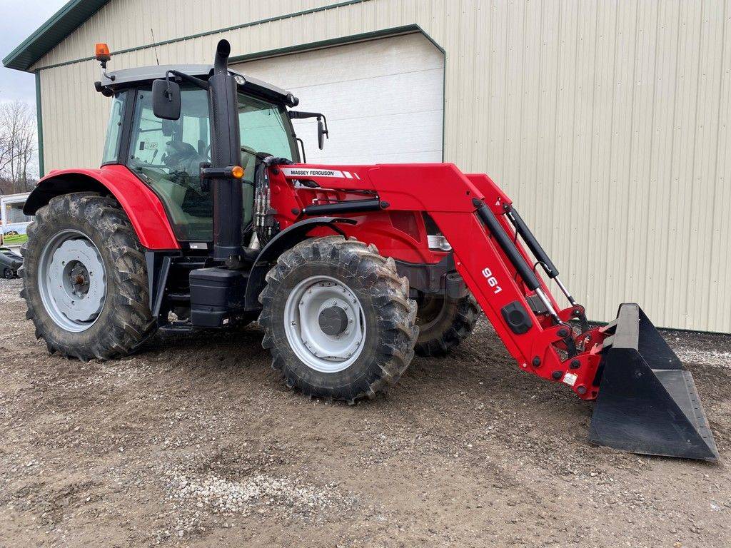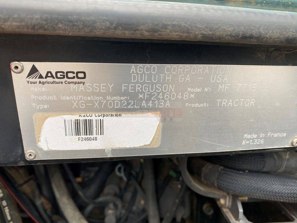 2015 Massey Ferguson, 7715, CAB, 711 HOURS, 4X4, 3 POINT, 540 PTO, 3 REAR REMOTES, DRAWBAR, BRUSHGUARD, HEAT & A/C, RADIO, 16F/16R DYNA-4 POWERSHIFT TRANSMISSION, LHR, 120 HP AGCO DIESEL ENGINE, 27,600 LB OPERATING WEIGHT, 961 LOADER W/ 84″ BUCKET, 14.9R28 FRONT TIRES, 18.4R38 REAR TIRES, FRESH SERVICE & MULTI-POINT INSPECTION COMPLETED BY A CERTIFIED TECHNICIAN.