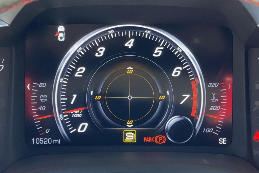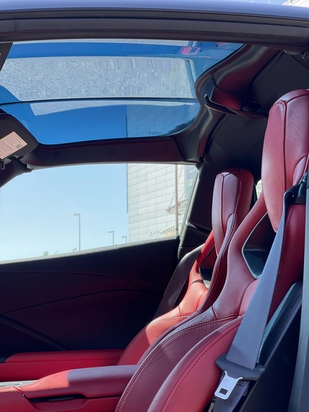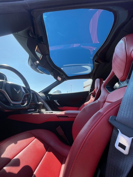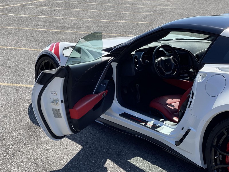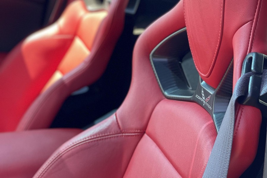 Factory equipment includes the Z07 Performance Package, the Body-Color Dual Roof Package, 19-inch front and 20-inch rear wheels, an electronic limited-slip differential, a performance exhaust system, a carbon fiber hood, Mulan leather upholstery, heated and ventilated Competition Sport bucket seats, a Bose 10-speaker audio system, and front curb view parking cameras.