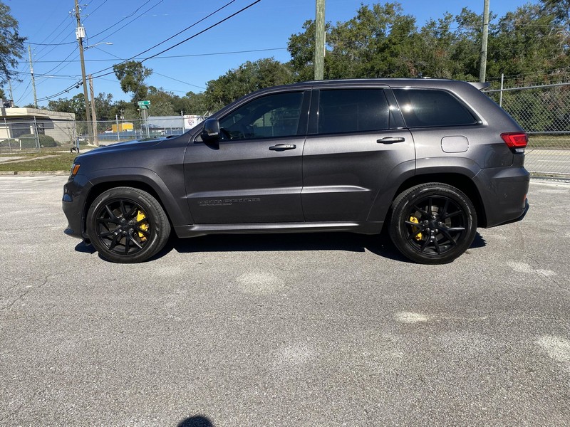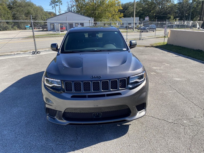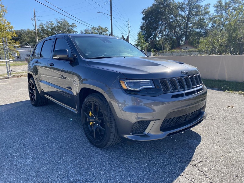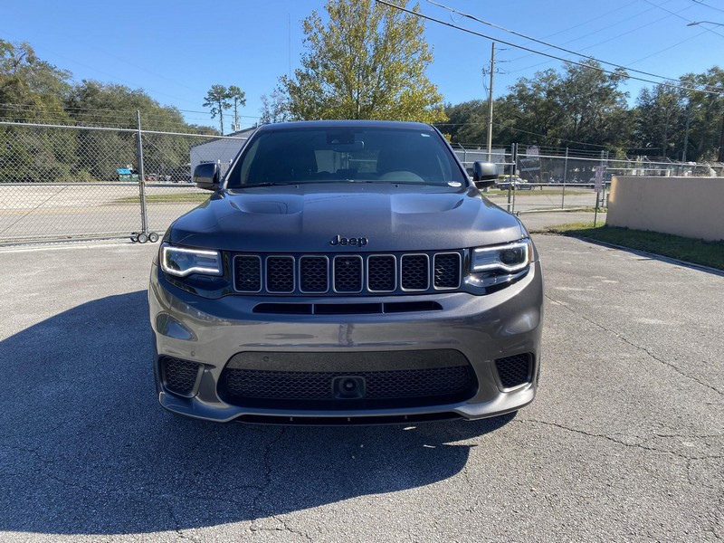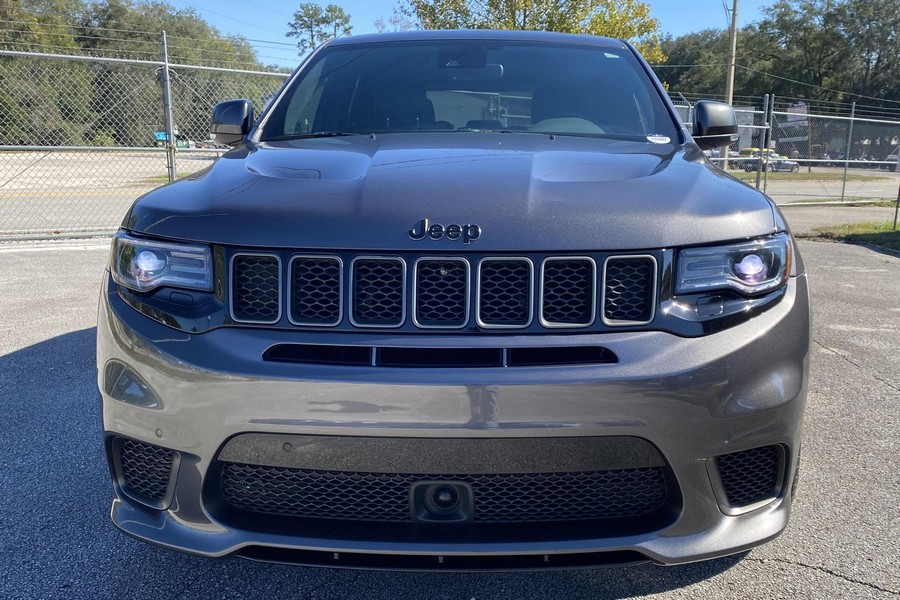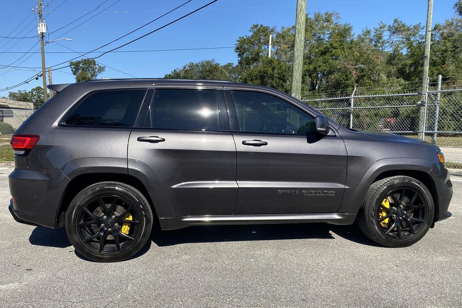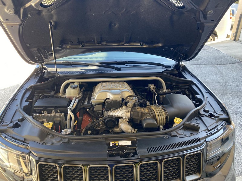THIS… is a 2018 Jeep Grand Cherokee Trackhawk, finished in Granite Crystal Metallic with a black interior. It came equipped with the Customer Preferred Package 2XV, Quadra-Trac active on-demand 4WD, Brembo brakes, Bilstein Competition suspension system with active damping, suede and Nappa leather performance seats, a heated steering wheel, navigation system, and more as detailed below. Modifications reported by the seller include a strut tower brace and dealer-installed window tint. Power comes from a supercharged 6.2-liter V8, rated at 707 horsepower and 645 lb-ft of torque. Output is directed to all four wheels through an 8-speed automatic transmission.