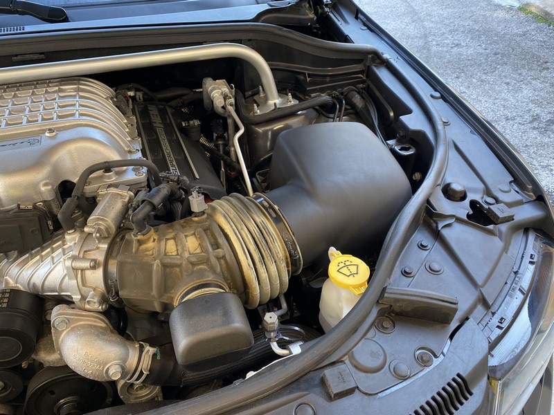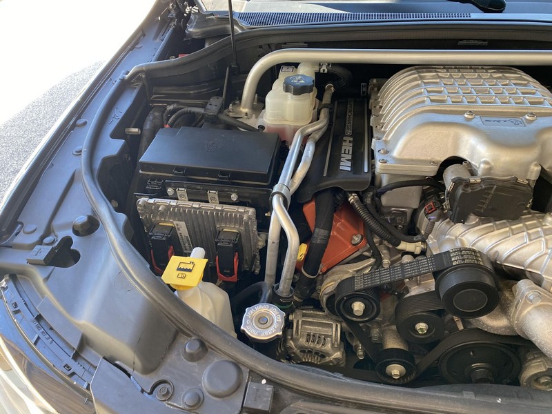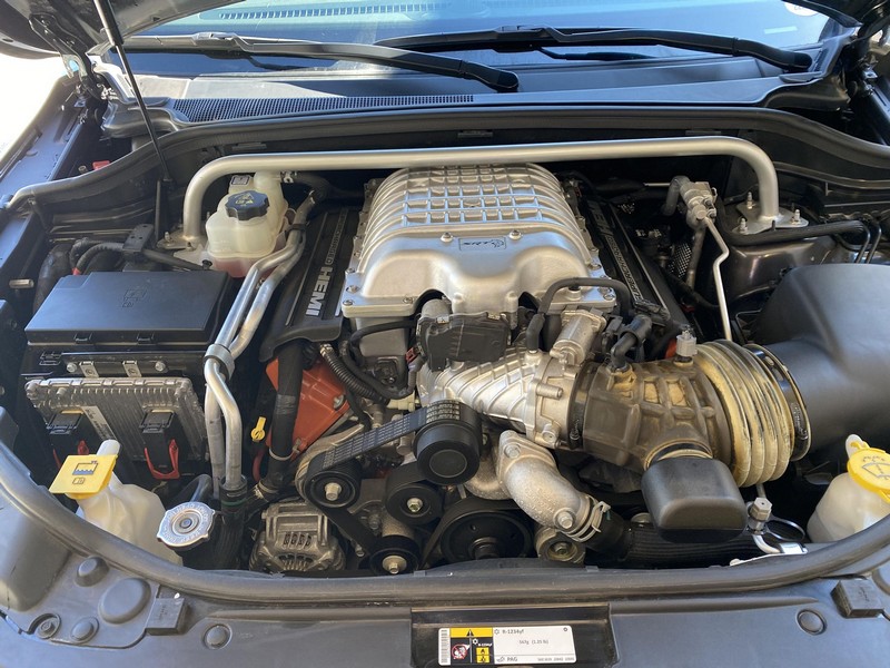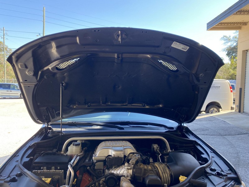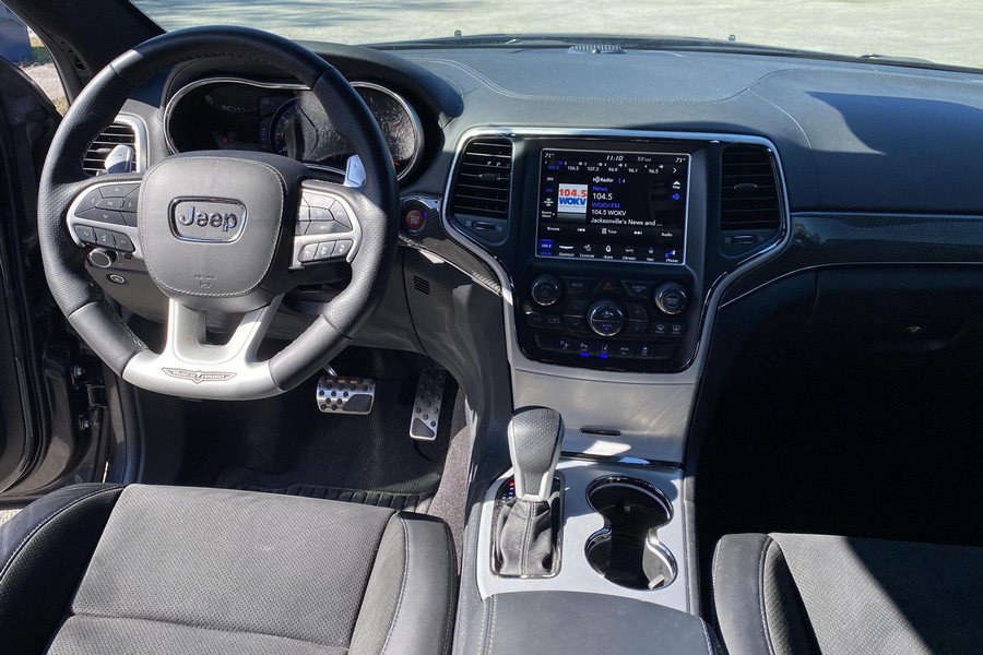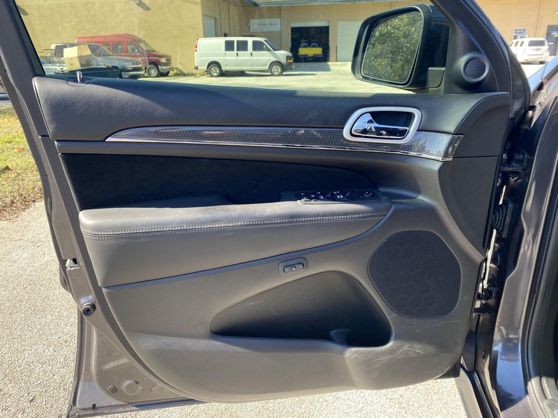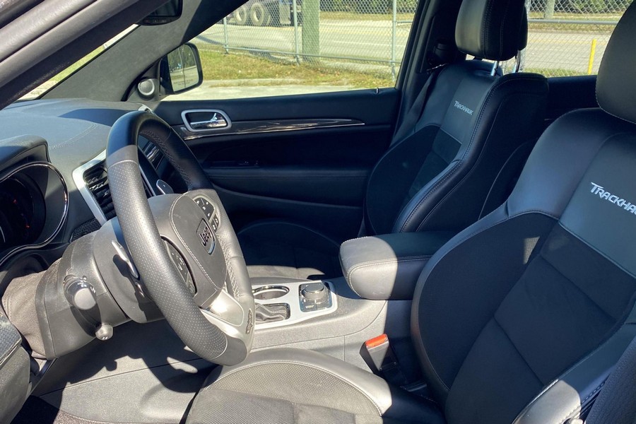 THIS… is a 2018 Jeep Grand Cherokee Trackhawk, finished in Granite Crystal Metallic with a black interior. It came equipped with the Customer Preferred Package 2XV, Quadra-Trac active on-demand 4WD, Brembo brakes, Bilstein Competition suspension system with active damping, suede and Nappa leather performance seats, a heated steering wheel, navigation system, and more as detailed below. Modifications reported by the seller include a strut tower brace and dealer-installed window tint. Power comes from a supercharged 6.2-liter V8, rated at 707 horsepower and 645 lb-ft of torque. Output is directed to all four wheels through an 8-speed automatic transmission.