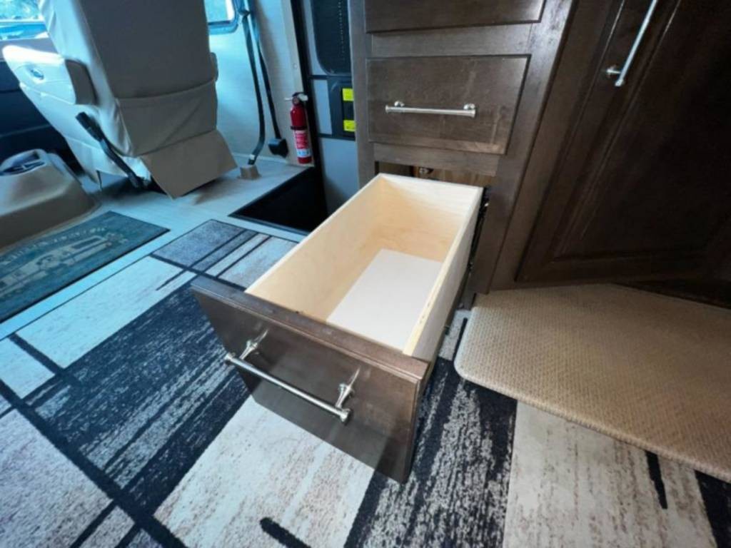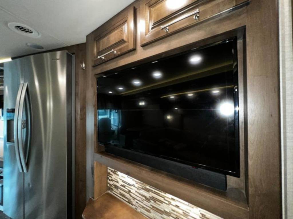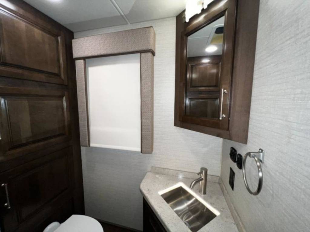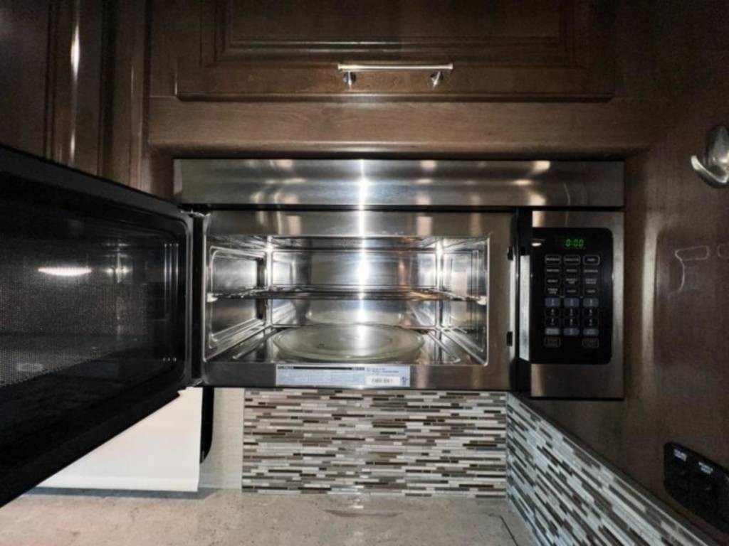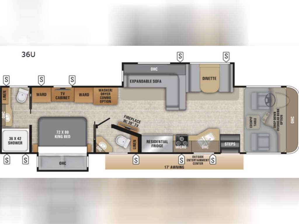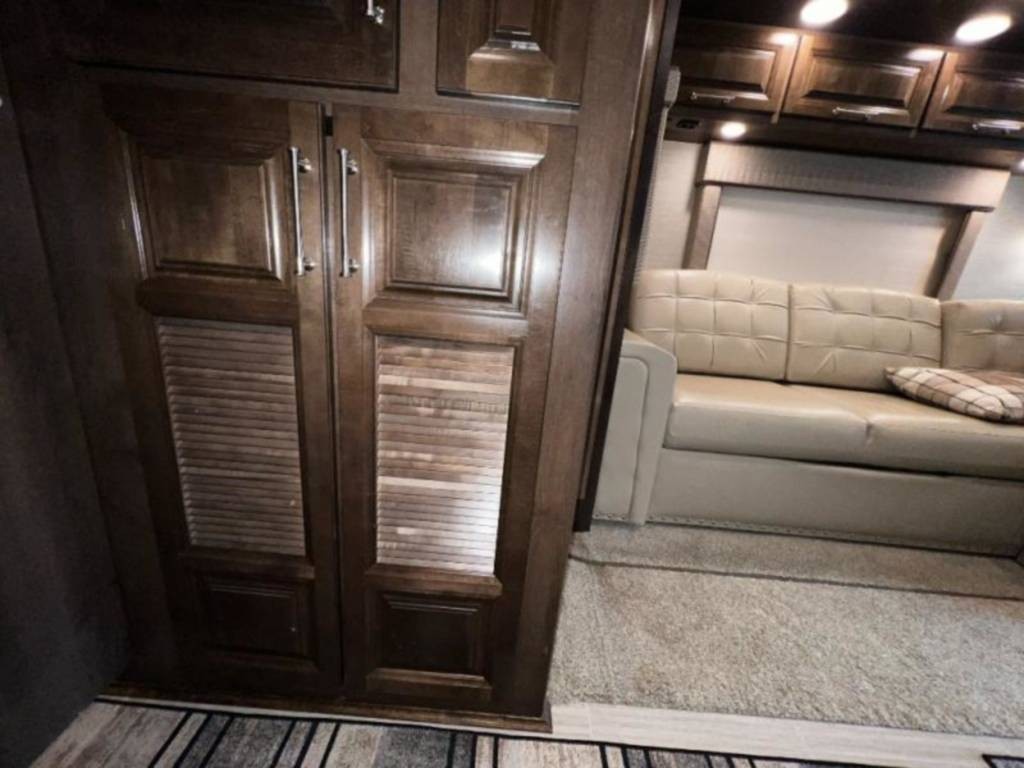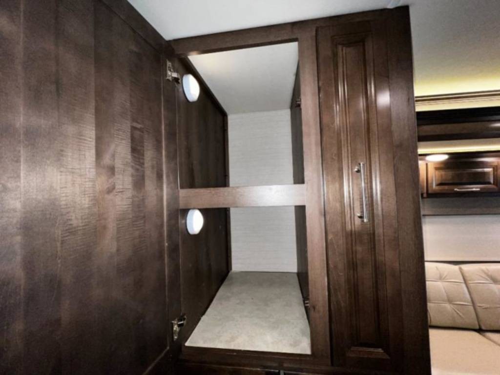The residential feel of this coach not only promises comforts and conveniences for your entire journey, but the look and feel once you step inside tells you that luxury living is going to be your new way of travel. You are going to enjoy the spacious interior thanks to two nice size slides. Once parked, and the slides are opened up, sink back into the extendable sofa and enjoy a cozy fire in the fireplace as you watch your favorite program on the 39″ LED TV provided. All of the residential appliances will make it easy to cook gourmet meals just like home. And, at bedtime, a king bed is waiting to whisk you off to dreamland! The rear bath offers privacy from the main living area up front, and there is also a half bath easily accessible during the day. Outside, you will find tons of storage space with a lockable pass-through compartment that makes packing and storing your outdoor gear easy, and the 17′ electric awning with outside entertainment center provides a place to hang out both day and night protected from the elements while enjoying a bit of fresh air. You also have the option of adding a drop-down overhead bunk for added guests that wish to spend the night, plus so much more.