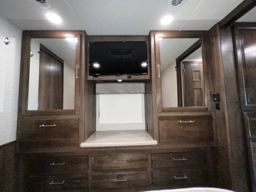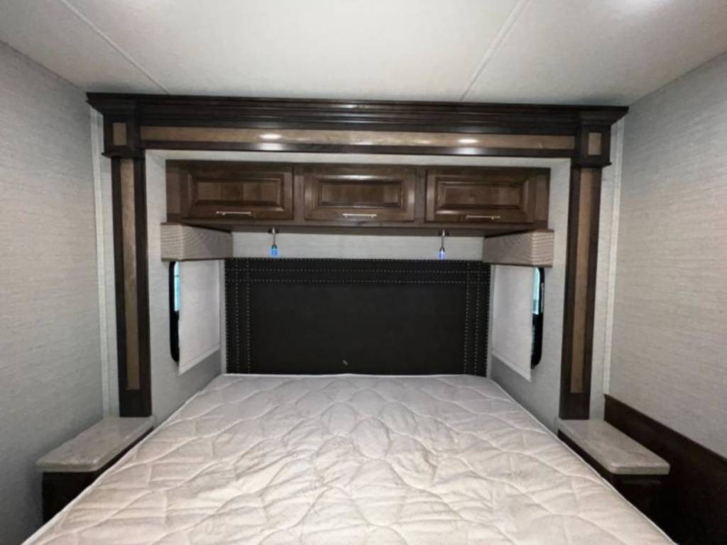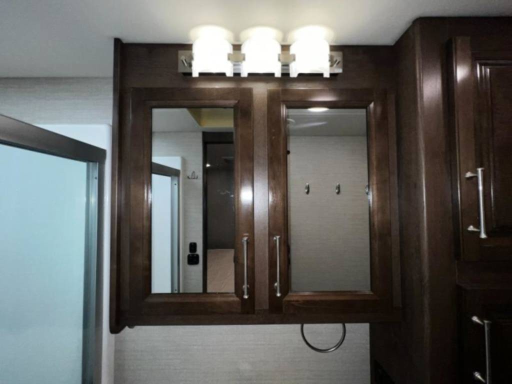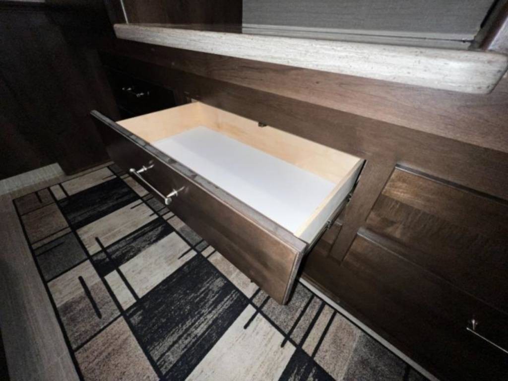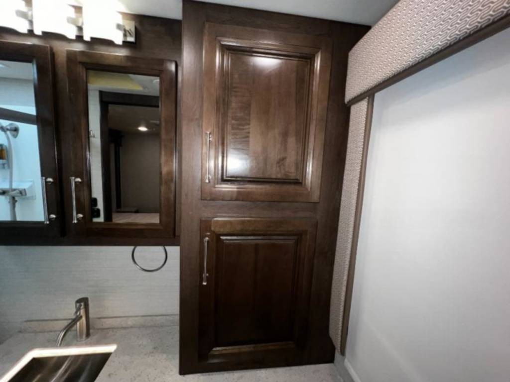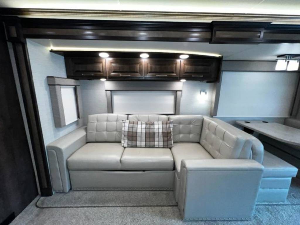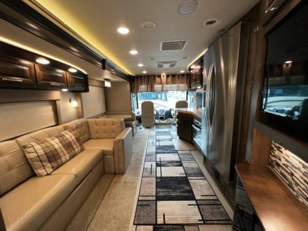 The residential feel of this coach not only promises comforts and conveniences for your entire journey, but the look and feel once you step inside tells you that luxury living is going to be your new way of travel. You are going to enjoy the spacious interior thanks to two nice size slides. Once parked, and the slides are opened up, sink back into the extendable sofa and enjoy a cozy fire in the fireplace as you watch your favorite program on the 39″ LED TV provided. All of the residential appliances will make it easy to cook gourmet meals just like home. And, at bedtime, a king bed is waiting to whisk you off to dreamland! The rear bath offers privacy from the main living area up front, and there is also a half bath easily accessible during the day. Outside, you will find tons of storage space with a lockable pass-through compartment that makes packing and storing your outdoor gear easy, and the 17′ electric awning with outside entertainment center provides a place to hang out both day and night protected from the elements while enjoying a bit of fresh air. You also have the option of adding a drop-down overhead bunk for added guests that wish to spend the night, plus so much more.