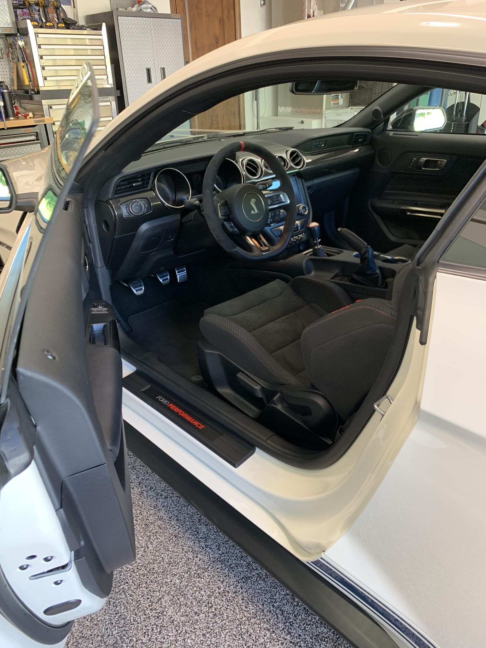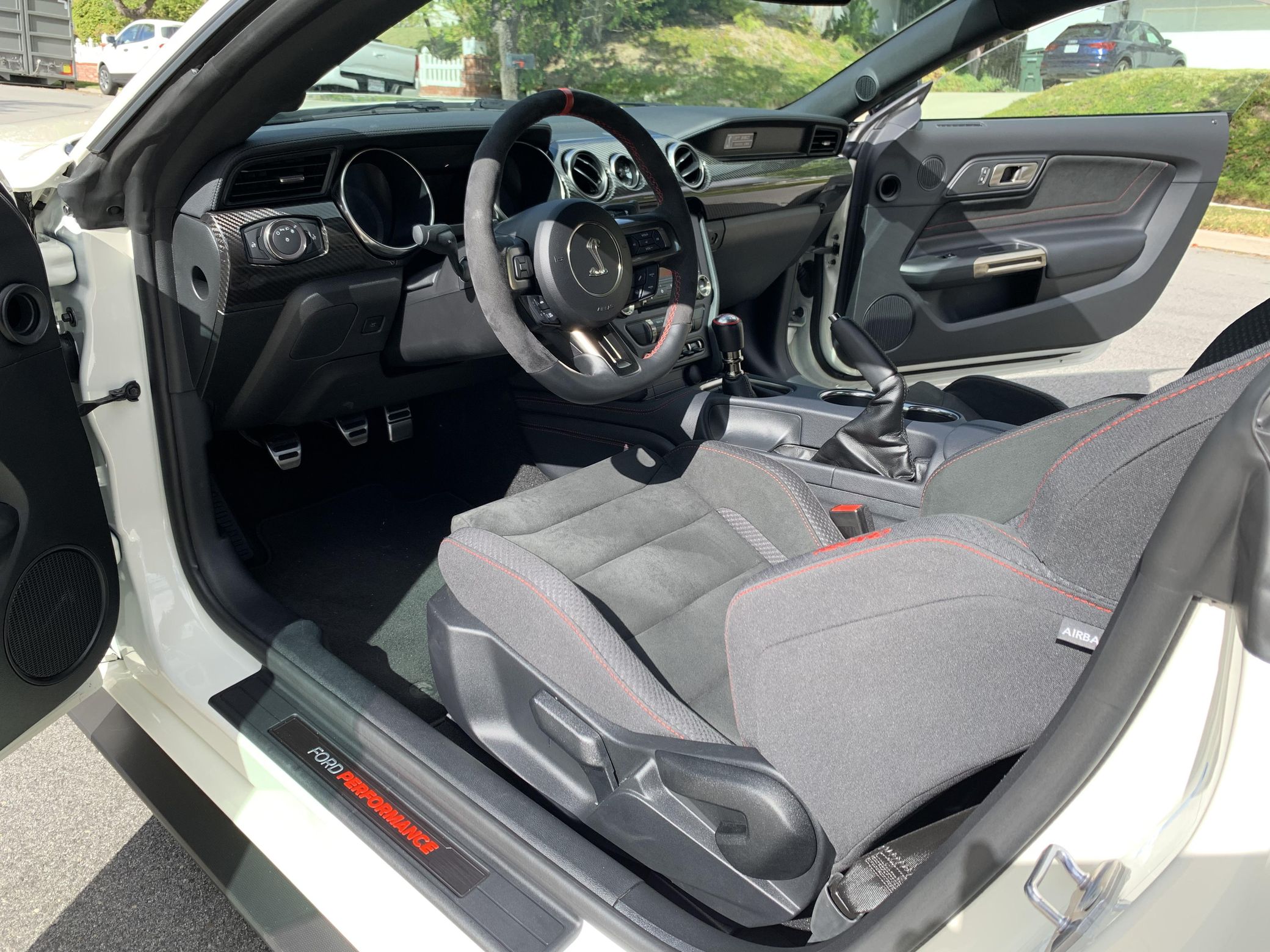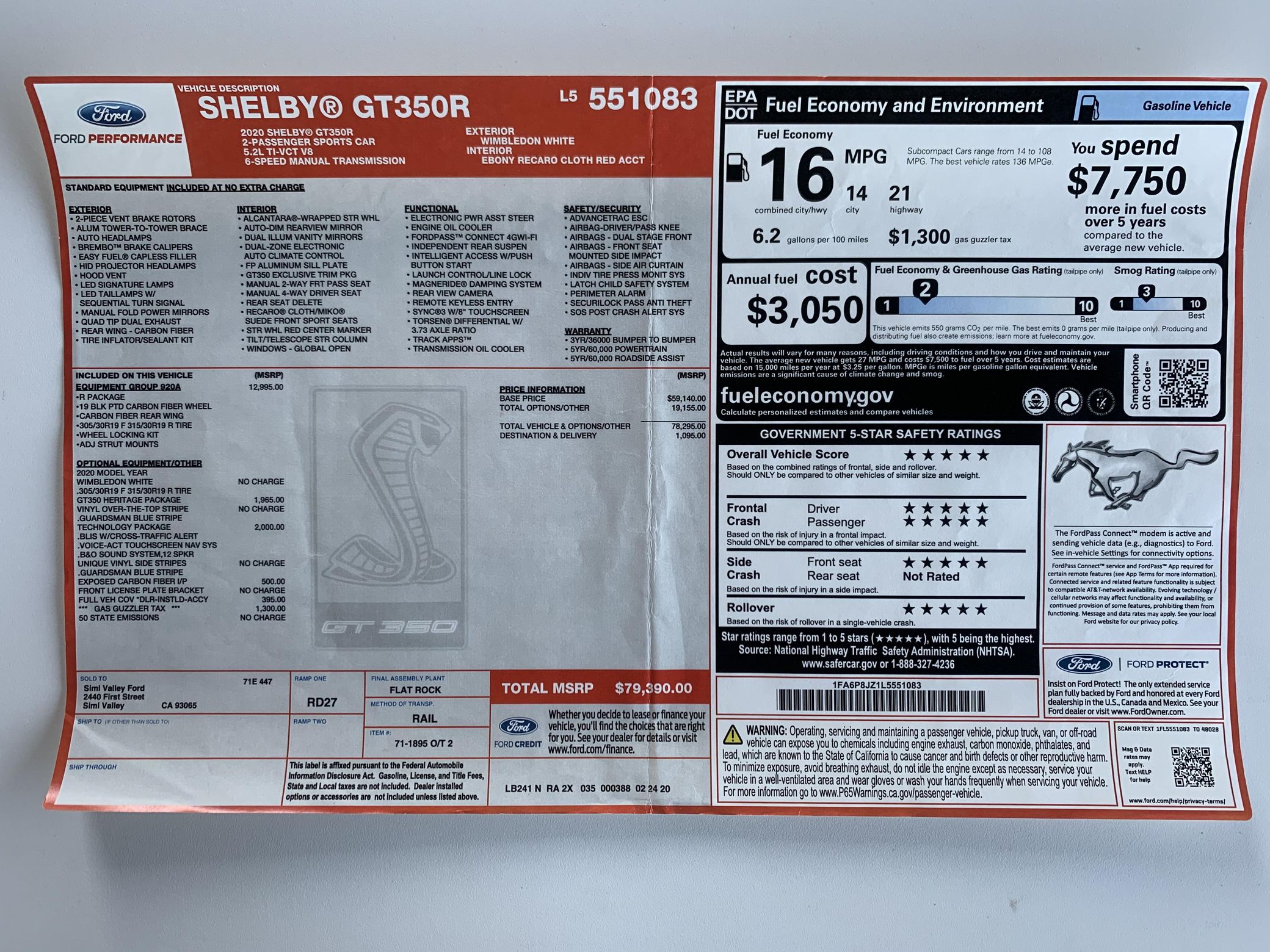 THIS… is a 2020 Ford Mustang Shelby GT350R, finished in Wimbledon White with a black interior. This Shelby features a desirable 6-speed manual transmission and the Heritage Edition Package of which only 280 units were produced. The attached Carfax history report indicates no accidents or mileage discrepancies. It also shows that this GT350R has been exclusively registered in California under a single owner. According to the window sticker provided in the photo gallery, a partial list of features includes the equipment group 920A, the GT350 Heritage Package, Technology Package, Magneride damping system, a 3.73 rear differential, independent rear suspension, launch control and “Line Lock,” and more as detailed below. Modifications reported by the seller include Ford Performance oil separators, paint protection film, Steeda rock guards, Steeda jack rails, and SLiPLo front spoiler protection. The Shelby GT350R variant of the “S550” Ford Mustang is a track-focused performance car benchmarked against competitors like the Chevrolet Camaro Z/28 and the Porsche 911 GT3. Compared to the standard GT350, it has improved grip, less weight, a more aggressive aerodynamic body kit, and it’s the first mass-produced road car to come stock with carbon fiber wheels, resulting in a highly competent muscle car for the track. Power for the Shelby GT350R comes from a flat-plane-crank “Voodoo” 5.2-liter V8 engine, rated at 526 horsepower and 429 lb-ft of torque. Output is sent to the rear wheels via a 6-speed manual transmission.