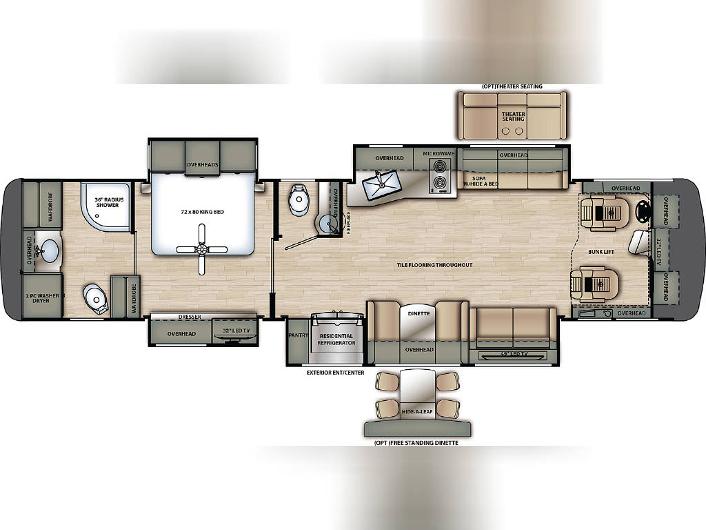 Sleep Options: King, Queen Pullout, Overhead Bunk, Jackknife Sofa